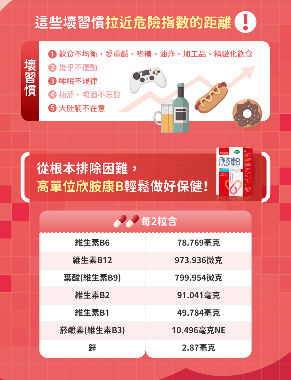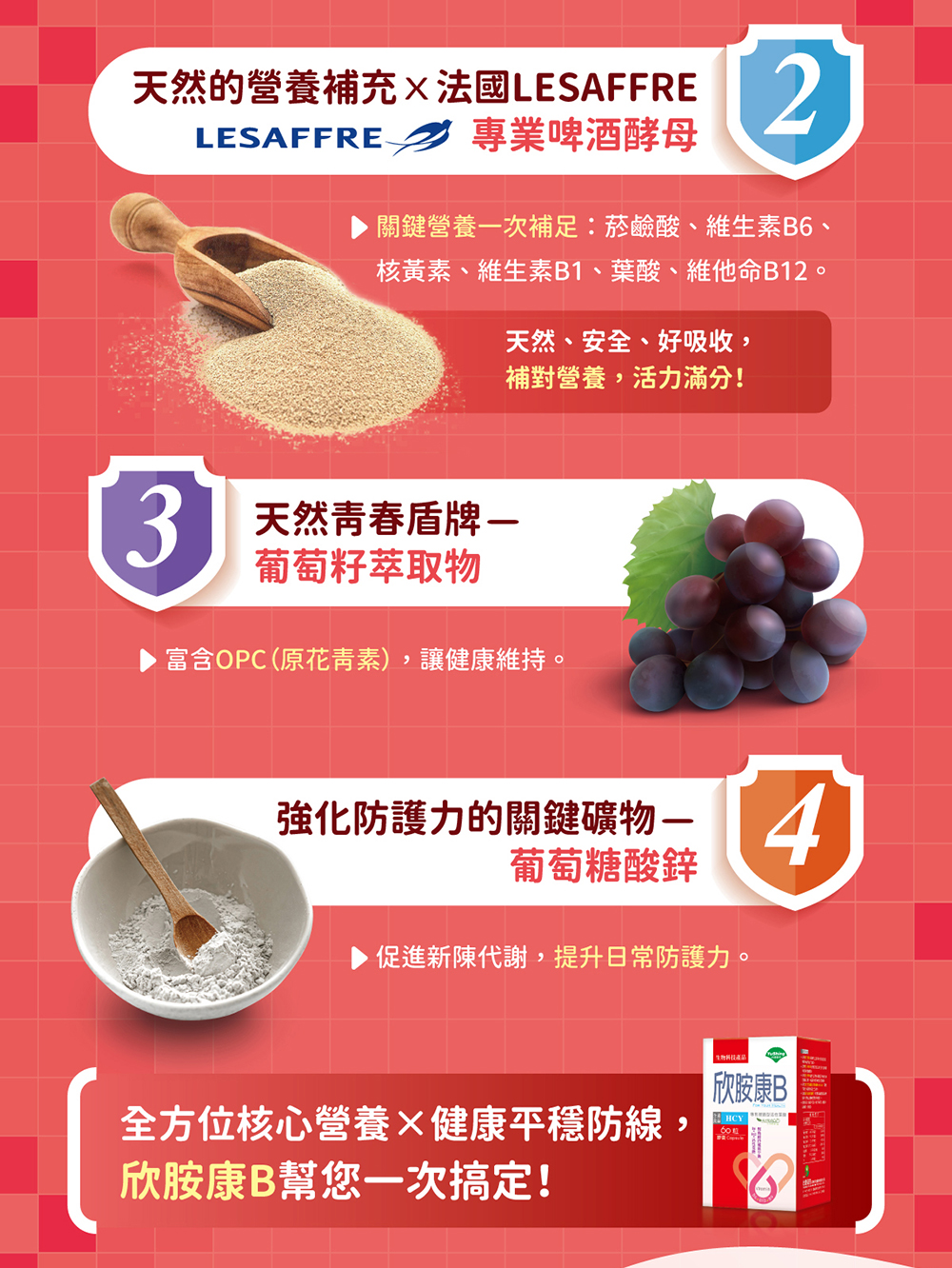 - 啤酒酵母、鹽酸吡哆辛(維生素B6) (維生素B6、麥芽糊精)、核黃素(維生素B2)( 維生素B2、麥芽糊精)、鹽酸呋喃硫胺、難消化性麥芽糊精、葡萄籽萃取物、葡萄糖酸鋅、二氧化矽、硬脂酸鎂、L-5-甲基四氫葉酸鈣、氰鈷胺明(維生素B12)