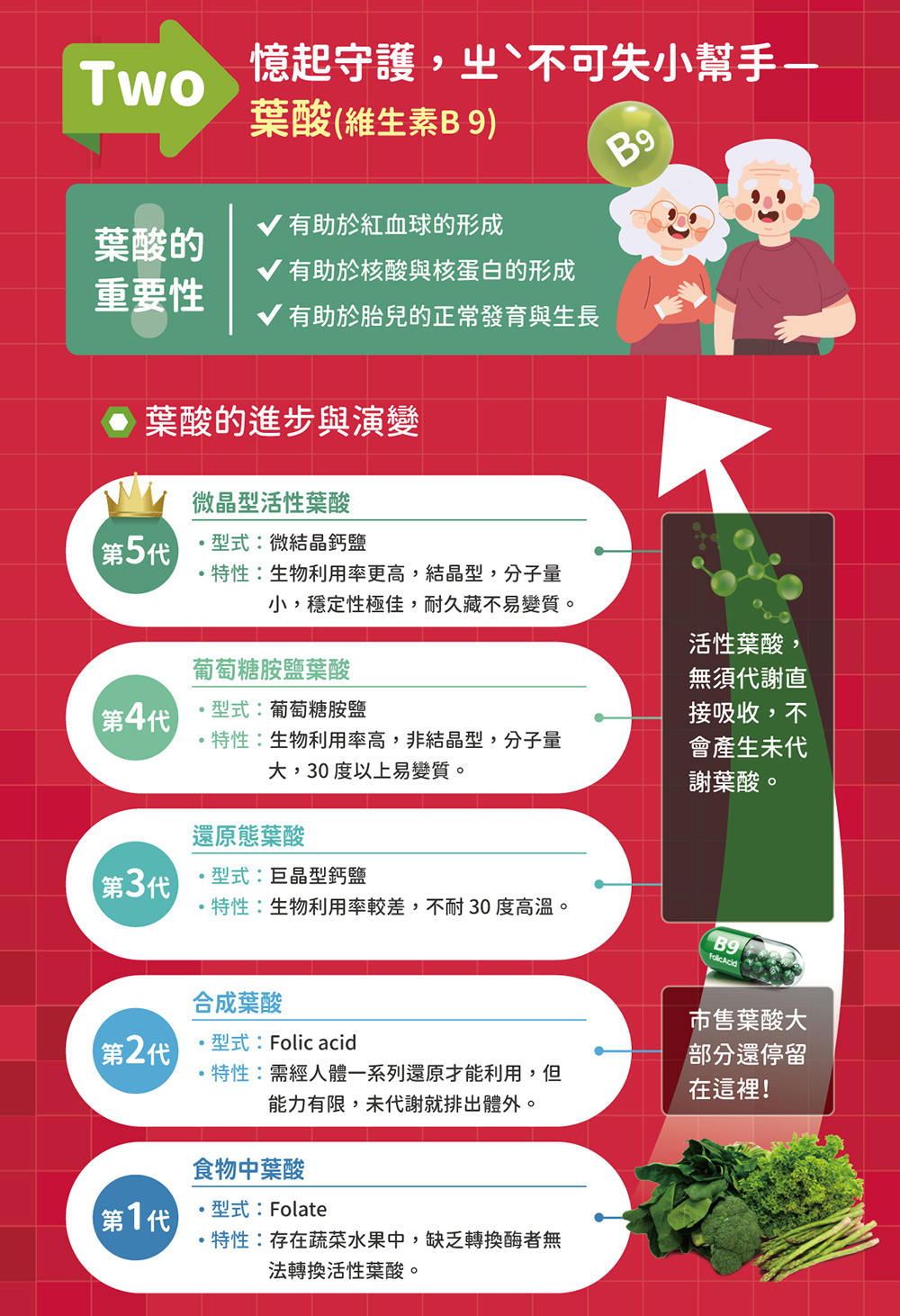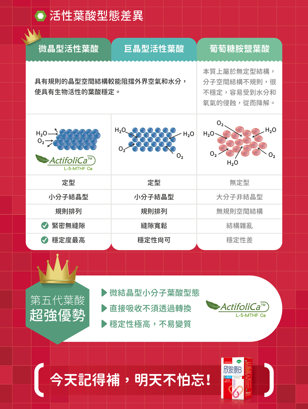 - 添加第五代微晶型活性葉酸ActifoliCaTM,葉酸有助於核酸與核蛋白的形成