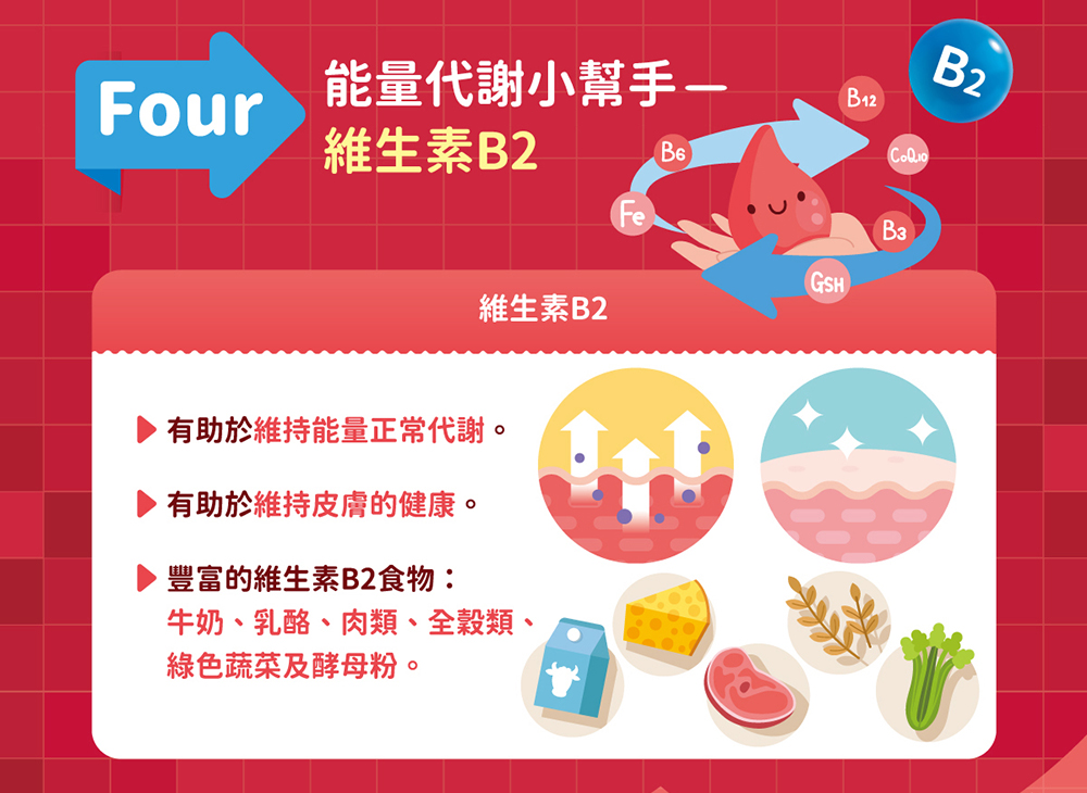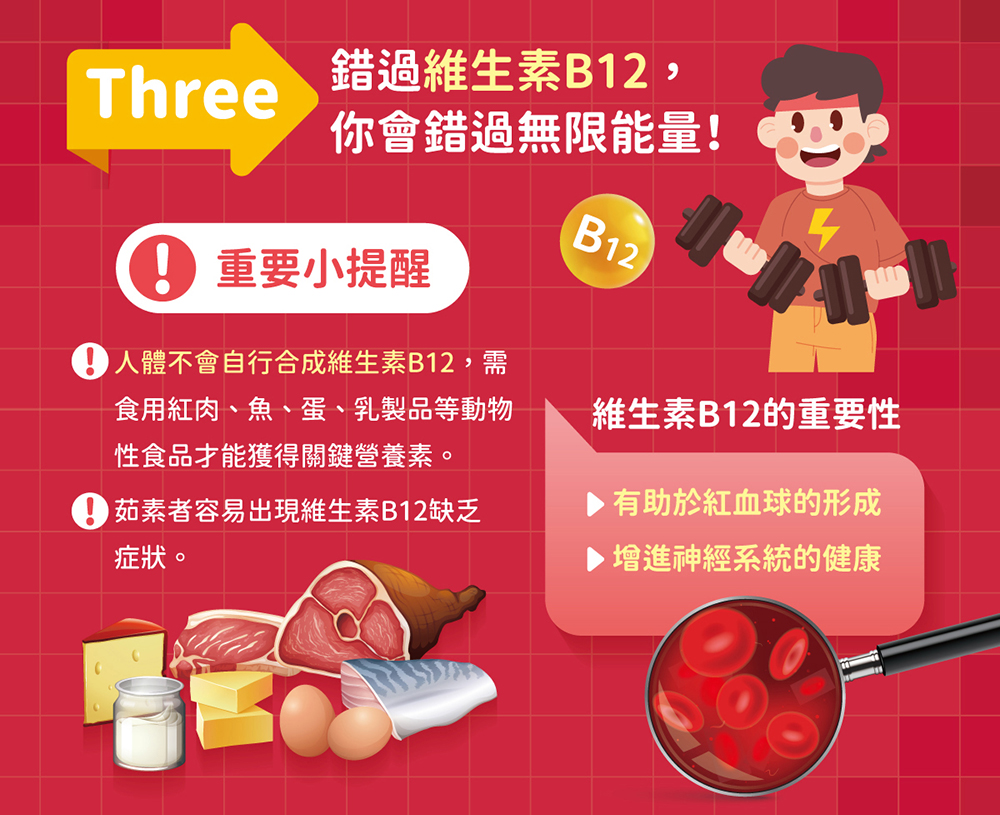 - 含有維生素B12能有助於紅血球的形成及增進神經系統的健康