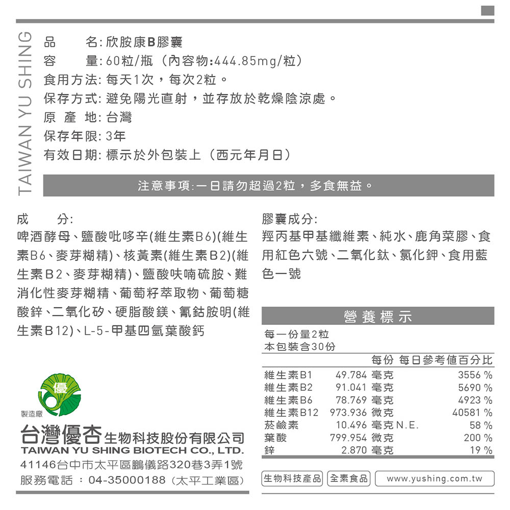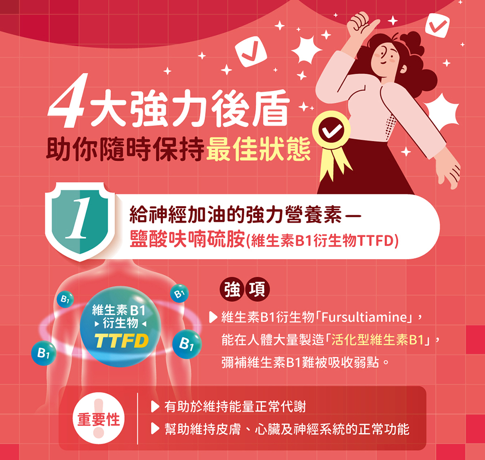 - 含有維生素B1能有助於維持能量正常代謝,幫助維持皮膚、心臟及神經系統的正常功能
