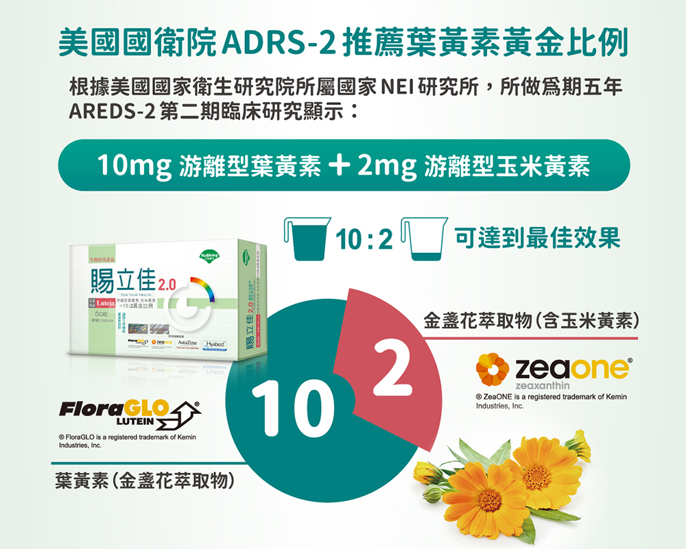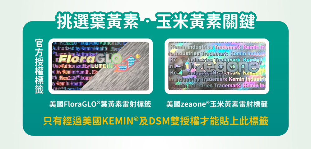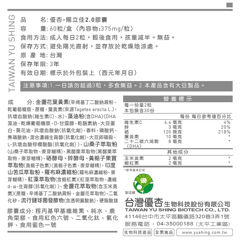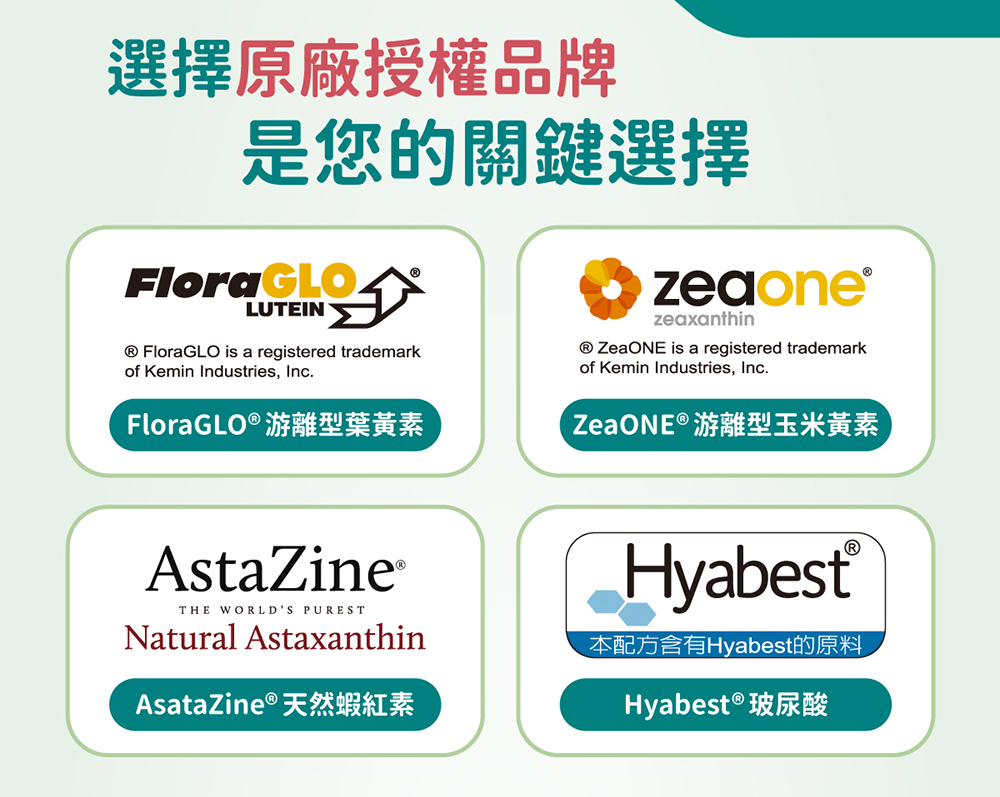 - 成分: 金盞花葉黃素(辛烯基丁二酸鈉澱粉、葡萄糖、蔗糖、葉黃素、維生素C、水)、裂壺藻粉(含DHA)(葡萄糖漿、DHA藻油、辛烯基丁二酸鈉澱粉、D-甘露醇、葵花油、抗壞血酸鈉(抗氧化劑)、脂肪酸甘油酯、多磷酸鈉、磷酸鈣、天然香料、混合濃縮生育醇(抗氧化劑)、卵磷脂(葵花)、L-抗壞血酸棕櫚酸酯(抗氧化劑))、山桑子萃取粉(山桑子萃取物、麥芽糊精)、黑醋栗萃取物(黑醋栗萃取物、麥芽糊精)、硒酵母、鋅酵母、黃梔子果實萃取物(天然黃梔子色素)(麥芽糊精、梔子萃取物)、印度山苦瓜萃取粉、羅布麻濃縮粉(羅布麻濃縮粉、麥芽糊精)、紅藻萃取物(含蝦紅素)(紅藻萃取物、混合濃縮生育醇(抗氧化劑))、金盞花萃取物(含玉米黃素)(蔗糖、辛烯基丁二酸鈉澱粉、金盞花萃取物)、二氧化矽、流行鏈球菌發酵物(含透明質酸鈉)、硬脂酸鎂 膠囊成分:羥丙基甲基纖維素、純水、鹿角菜膠、食用紅色六號、二氧化鈦、氯化鉀、食用藍色一號