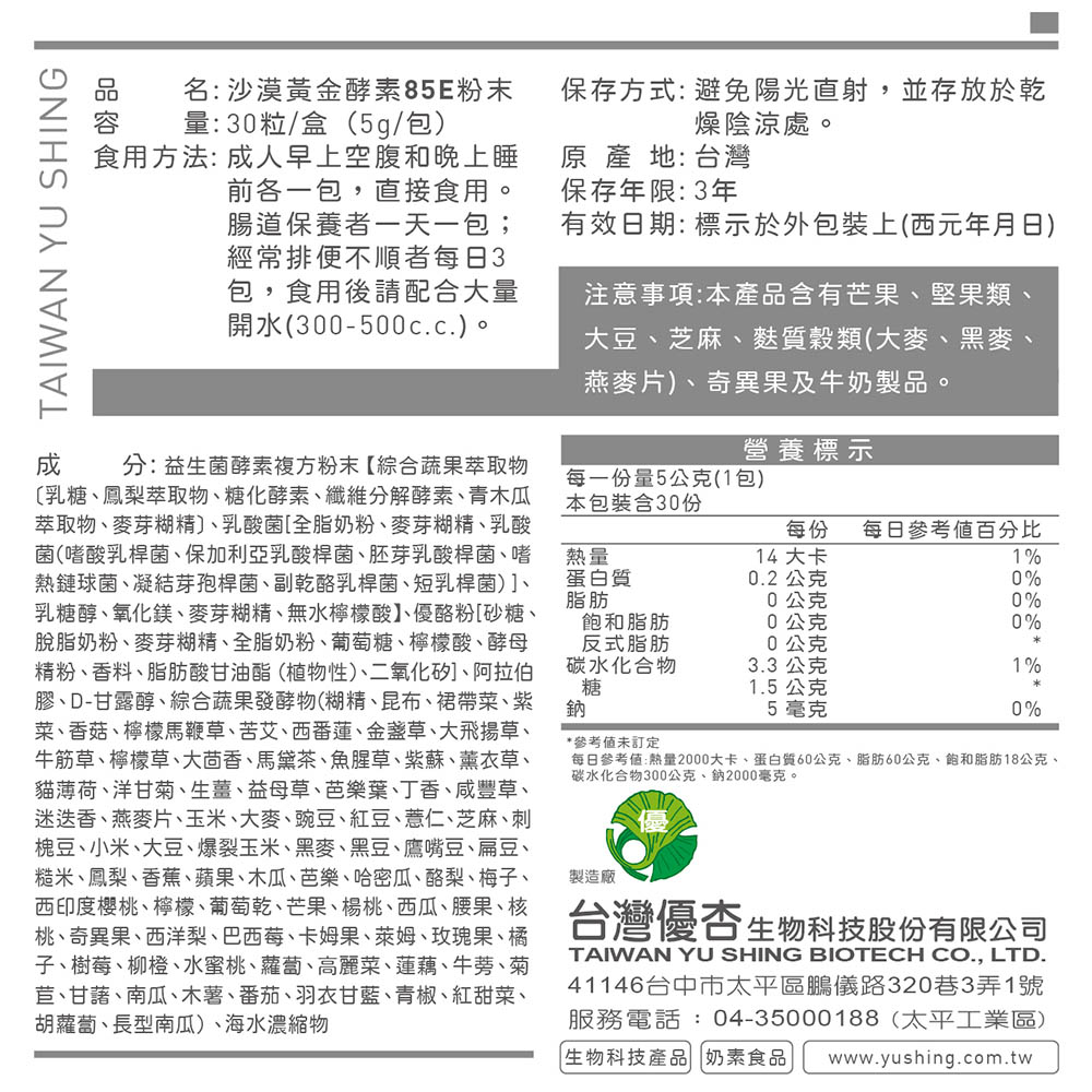 - 沙漠黃金酵素85E能創造有感有酵的加乘作用,全方位呵護與維持消化道機能,幫助守護您的健康,是不可缺少的順暢保養補充品