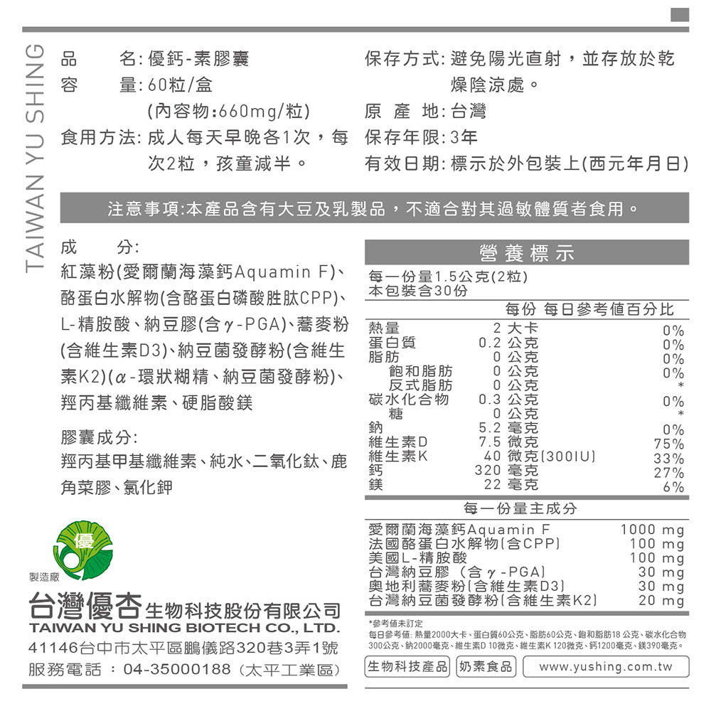 - 膠囊成分:羥丙基甲基纖維素、純水、二氧化鈦、鹿角菜膠、氯化鉀