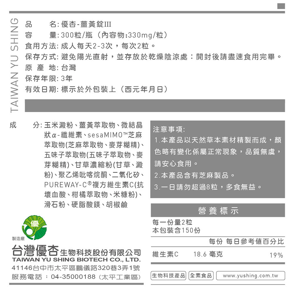 - 玉米澱粉、薑黃萃取物、微結晶狀α-纖維素、SesaPlexTM芝麻萃取物(芝麻萃取物、麥芽糊精)、五味子萃取物(五味子萃取物、麥芽糊精)、甘草濃縮粉(甘草、澱粉)、聚乙烯吡喀烷酮、二氧化矽、PUREWAY-C®複方維生素C(抗壞血酸、柑橘萃取物、米糠粉)、滑石粉、硬脂酸鎂、胡椒鹼。